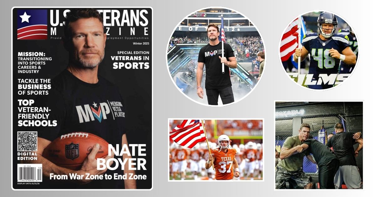 Nate Boyer has never been one to take the easy road. A former Green Beret who later suited up for the NFL, Boyer has built his life around challenge, resilience and purpose. Today, as a filmmaker, entrepreneur and co-founder of Merging Vets and Players (MVP), he continues that mission—helping veterans and athletes navigate life after their uniforms are retired. His path, unconventional at every turn, is what makes him the perfect fit for the cover of our inaugural Veterans in Sports issue.